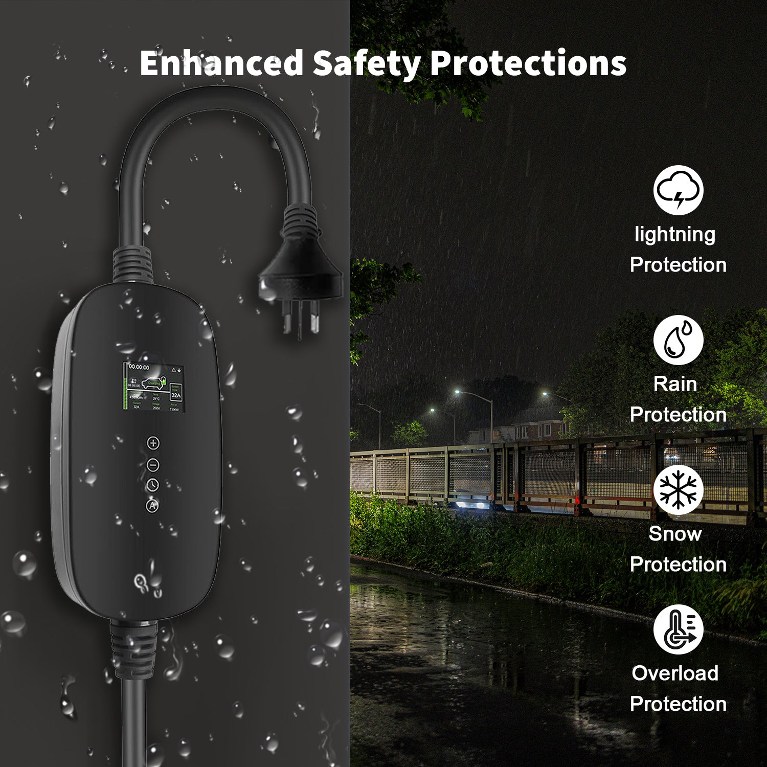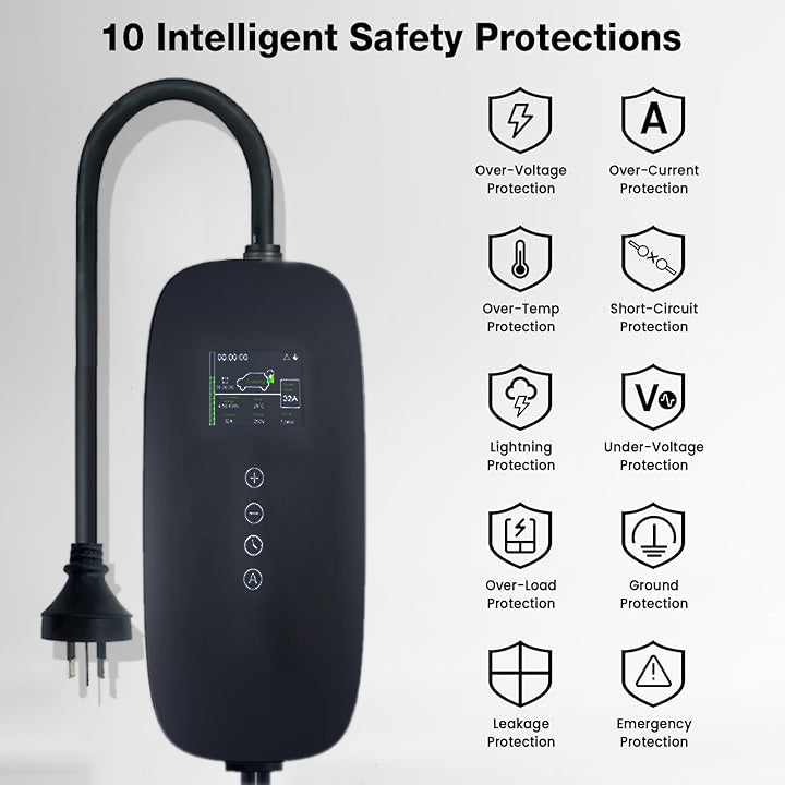 Our portable EV charger features a 2.4-inch LCD display for real-time monitoring and can be controlled remotely via The Smart Life App, using both WiFi and Bluetooth.